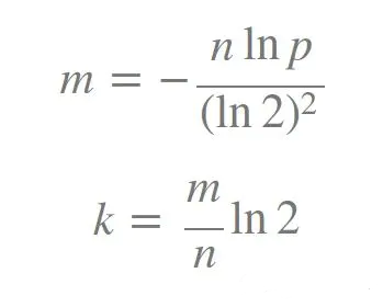 对于布隆过滤器的bit位数m,插入元素数量n,误报率p,哈希函数个数k,我们可以使用以下的公式在决定哈希函数个数和布隆过滤器长度。